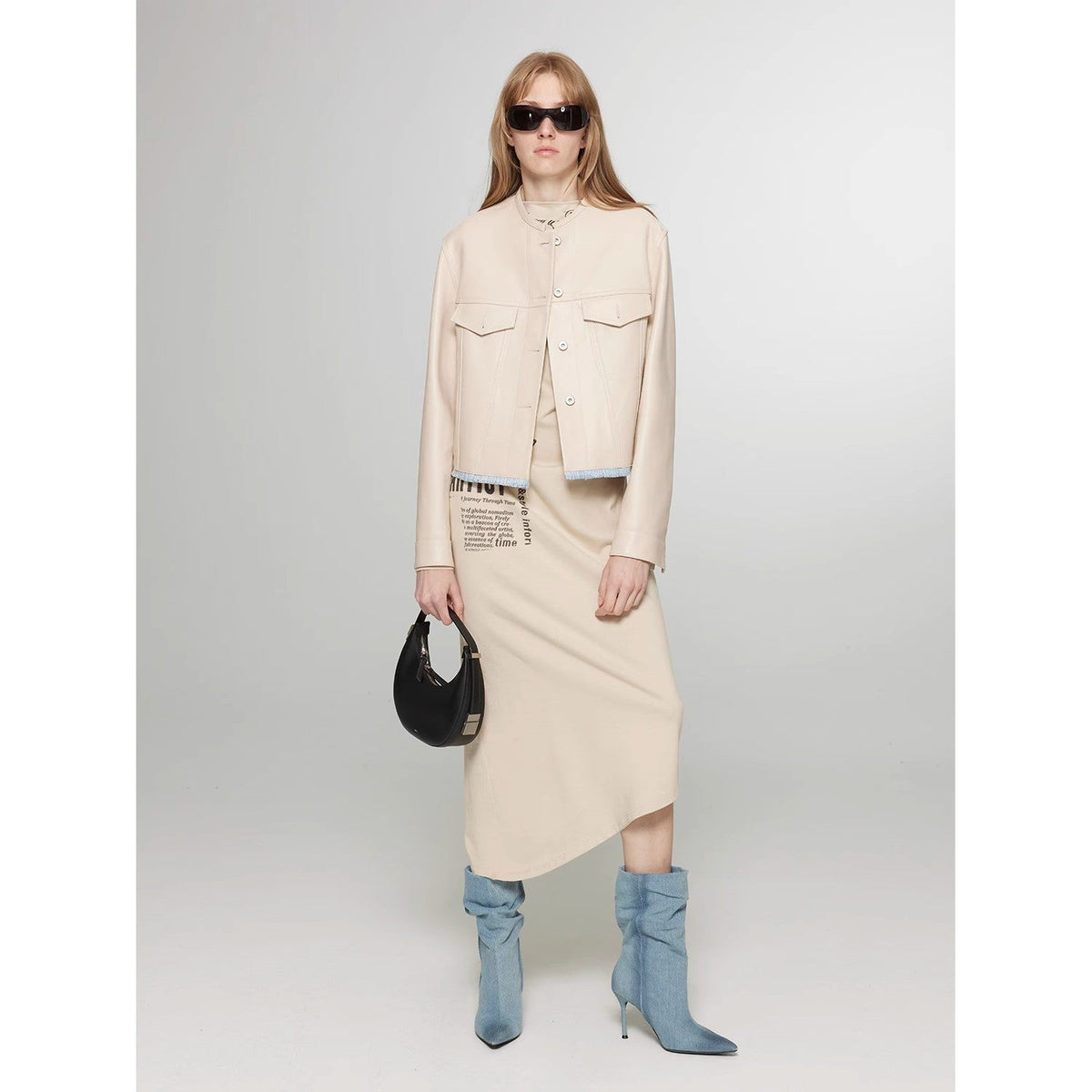 Retro Suede Sheep Leather Short Jacket with Structured Shoulders and Round Neck, Genuine Leather Outerwear "Sunset Escape" - S(4-6) / Light Khaki